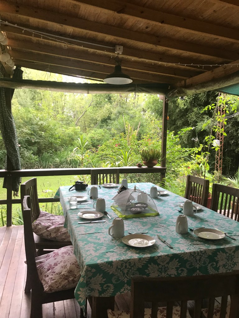 They arranged for us to be collected in shared taxis and taken to the dock in Tigre one hour away . From there we took a river taxi (here I imagined the beautiful wooden style boats a la Venice, head scarf and dark glasses donned, a la Audrey Hepburn, but sadly we were met with a rickety old fishing boat, with a purple driver’s seat, grey shag pile walls, rear view mirror and a sign for the emergency exit at the back of the boat! No scarf or sunglasses were needed here. We arrived at Ana and Ralph’s jetty where they were both excitedly waiting for us to take us on our adventure.