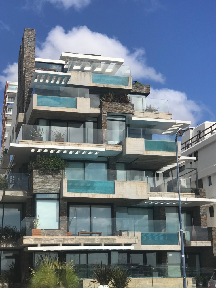 I had no idea what to expect but it wasn’t this. One man we met on our travels had told us how much he preferred the streets of Montevideo (the Capital of Uruguay), to those of Buenos Aires as everything seemed much more clean and organised, and he was right. Every house on the street was different. There didn’t seem to be any such thing as planning regulations. From multi coloured hostels (actually yellow with a red roof so at first I thought it was the Uruguayan version of McDonalds) to thatched cottages to modern houses with wall to ceiling glass sides, high rise apartments some with individual tiny pools on each balcony, the architecture was eye opening. The lawns were perfectly manicured and in front of them were lovely coastlines with wide beaches. The area is on a peninsula, so we could pick one side of beaches for sunrise, though we were never up in time for those, and the other side of beaches for sunset, and we always made sure we were in position for those. It was quite hard to get our bearings here, but Google Maps helped immensely! I normally have a good sense of direction but here I was well and truly flummoxed!