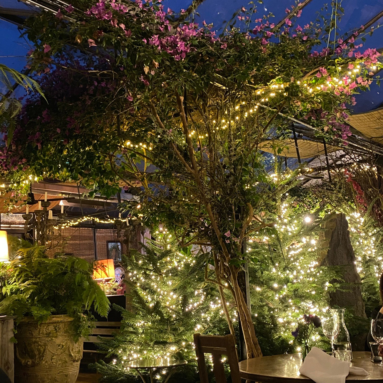 We set off on our adventure around lunchtime and started with a little detour through Richmond, one advantage of the lockdown was that we were able to get a table for lunch very easily at the well renowned Petersham Nurseries. What a treat that was. We parked in Ham Street car park and had a lovely 15 minute walk by the river to the cafe. There is minimal parking at Petersham Nurseries so be warned. It was fairly busy when we arrived. Such beautiful surroundings, a number of connected greenhouses with virgin earth to complement the greenery all around, as well as the necessary overhead heaters, we really felt like we were eating in beautiful gardens, and as we arrived at 3pm, it wasn’t long before it got dark and all Christmassy with the lights in all the trees around us.