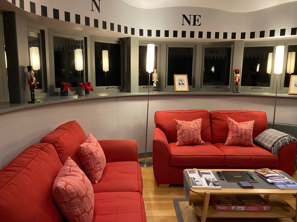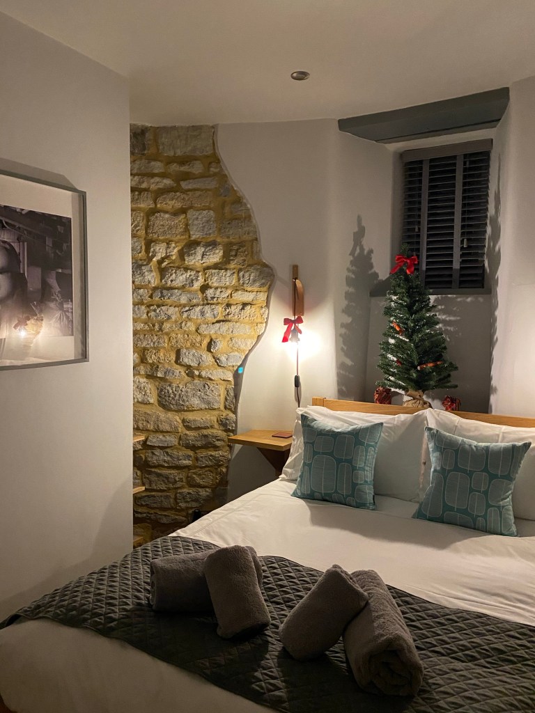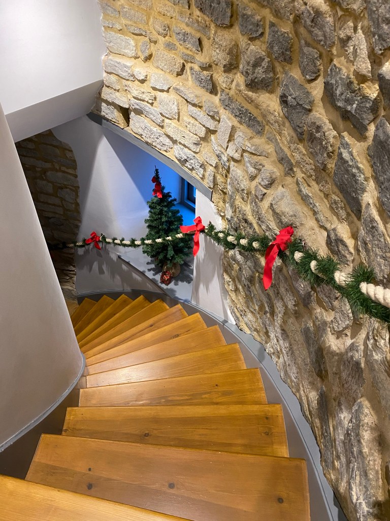 When we stepped inside we were faced with a Christmas wreath on the door straight ahead and lovely red bows and greenery twisted round the rope handrails up the stairs. I hate Christmas, bah humbug, but this was a lovely touch and an example of all the attention to detail that only enhanced the ambiance of the place. And then there were stairs, and more stairs, and more stairs. Each time you went up a flight, you thought you’d reached your room of choice, but no, there were more stairs. Just as well dogs weren’t allowed as our 2 little French bulldogs would never have made it up to the top, which is where the main lounge was! And they definitely wouldn’t have made it back down without injury!