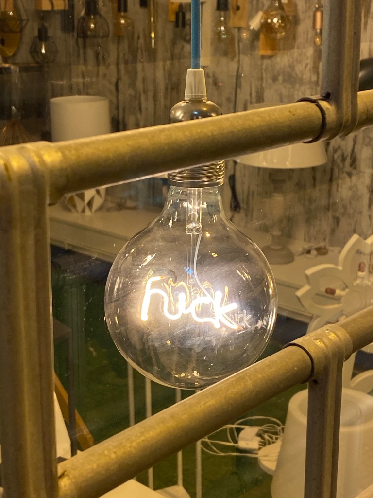 Seventy five minutes later, and no longer holding hands, after walking up and down residential roads and in and out of industrial estates we arrived at a nice looking sushi place but on the main road. Nobody in it as it had just opened for dinner at 7.30pm. However who knew that if you email a restaurant asking for a reservation and you don’t hear back from them, it means it’s a confirmed reservation!! Err, NO ONE!!! So despite trying and failing to convince them we could eat in 45 minutes and that their completely empty looking restaurant didn’t even look like it would ever be fully booked, off we stormed back out into the wilderness, or rather I stormed, he’s so laid back he may as well have crawled out. After another 30 minute walk the same boring way we came, but this time in silence, we found ourselves back in the Centre of Lecce. I was NOT happy and exceptionally hangry!! Close to tears if I’m honest. I had heels on for goodness sake!! This light bulb I spotted in a shop window a bit later on couldn’t have been more appropriate.