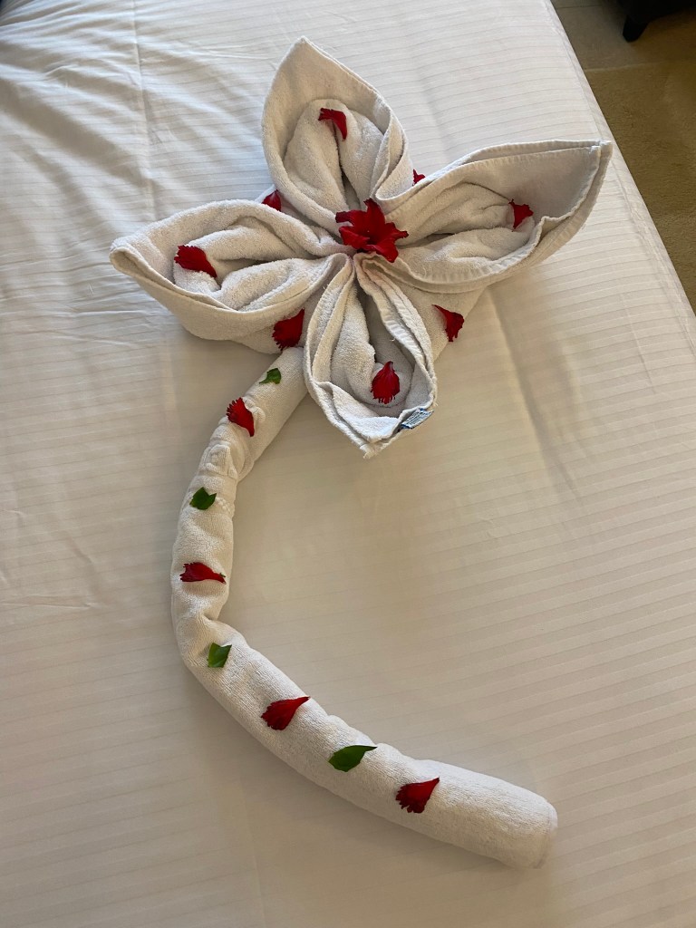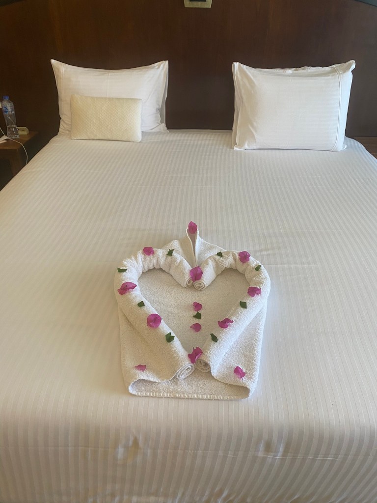 We had a double room with a stunning sea view and it was absolutely lovely. I especially appreciated the lack of a shower curtain in the bathroom. That’s always a win-win situation for me. Also no trip to Egypt would be authentic without the towel art! However, I would suggest a sea view or partial sea view room NOT overlooking the main pool area, because if you want a quiet night in see below for why it’s not possible in those rooms. We actually moved rooms for the last 3 nights as the hotel kindly put a family with 3 young, loud children in the room next to us, and parents who didn’t seem to care or be bothered by their constant shouting, tantrums, arguing etc. Our second room overlooked the spa pool which gave off a much calmer vibe and a good night’s sleep.