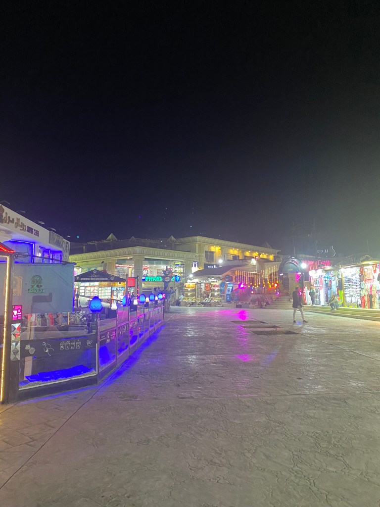 You can walk or jump in a taxi to Naama Bay from the hotel, as long as you don’t mind driving with no lights on, no seatbelt or having drivers who wait until you’re sat in the backseat and have nowhere to go before they call their wife, family and extended family members and have a good old chinwag instead focussing on the road, which is what at least 3 of our taxi drivers did!