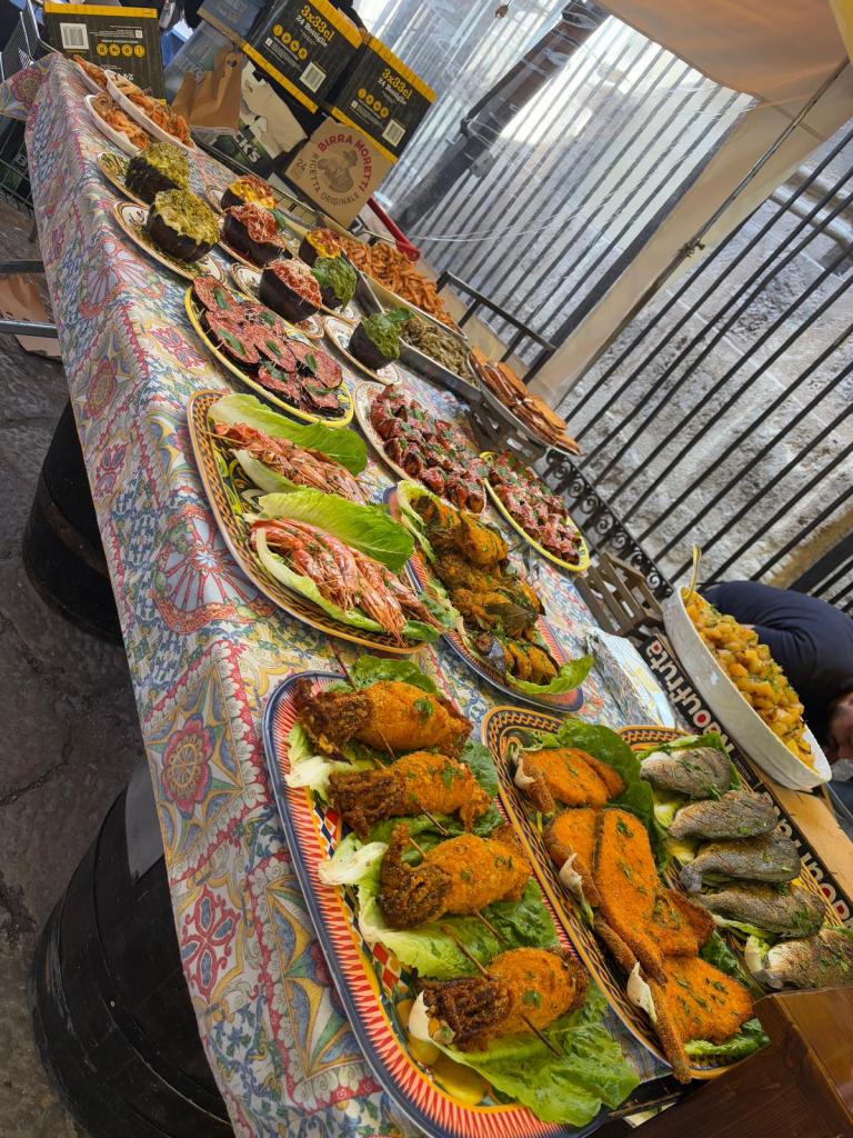 We found a great arancini bar, Arancini are a Sicilian specialty. So many different ones to choose from. There are few market stalls too at night, unless the police are around, in which case the very same market stalls are picked up and quickly wheeled away round a corner never to be seen again. Until 10 minutes later!